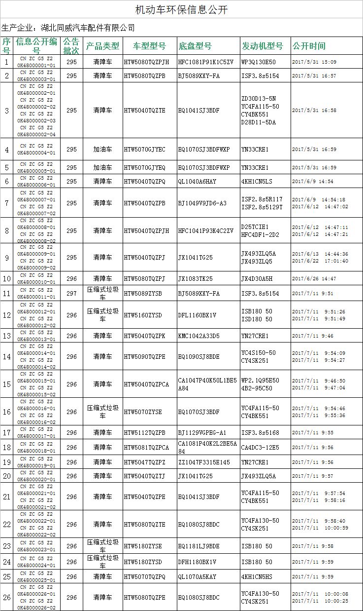 | 24 | CN ZC G5 Z2 0K48000024-01 | 296 | 壓縮式垃圾車 | HTW5180ZYSD | DFH1180BX1V | ISB180 50 | 2017/7/11 9:59 |